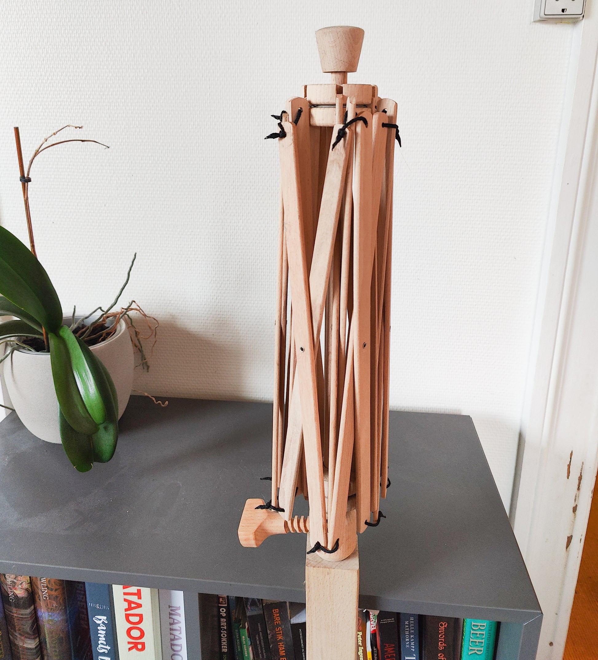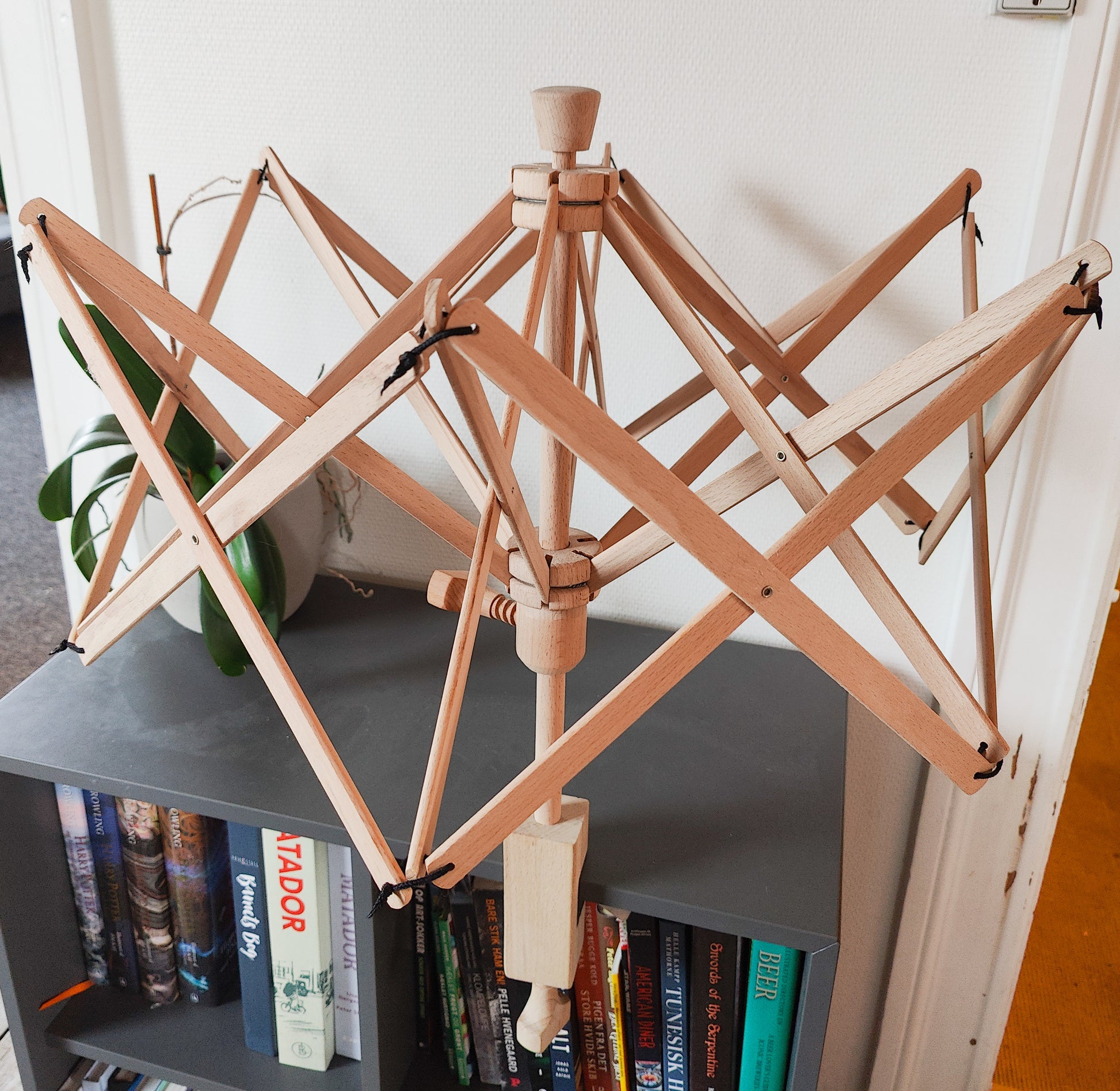Garnvinde i lyst træ. Garnvinden er uundværlig når du har købt garn i fed og skal vinde det op. Den sørger for at det ikke filtrer sammen mens du vinder op. Brug den sammen med et krydsnøgleapperat for at gøre det endnu lettere at vinde op.