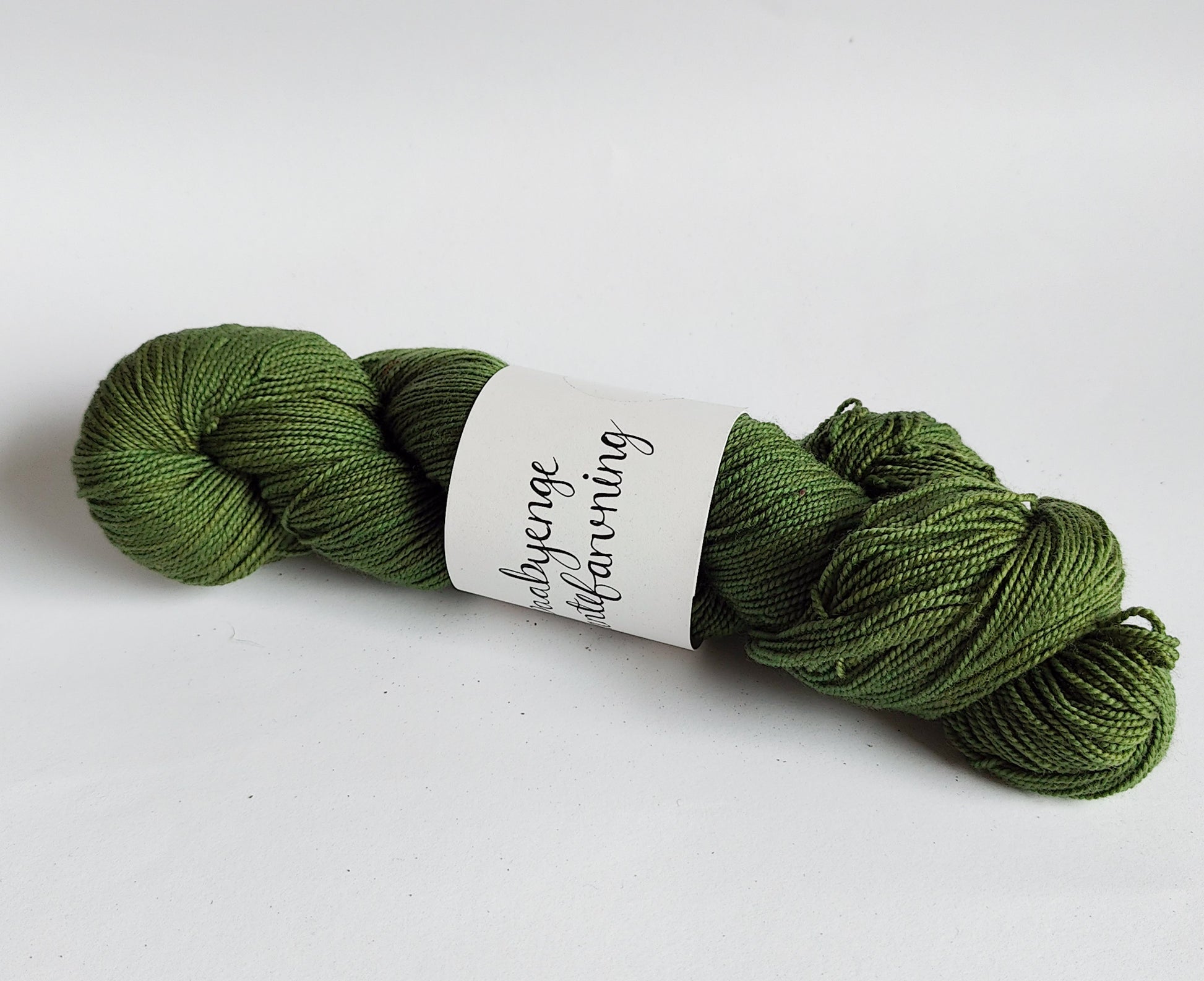 Denne utroligt flotte grønne farve har vi fået ved først at farve garnet gult med vild kørvel og derefter farve det over med indigo. På denne måde får garnet et utroligt flot spil.