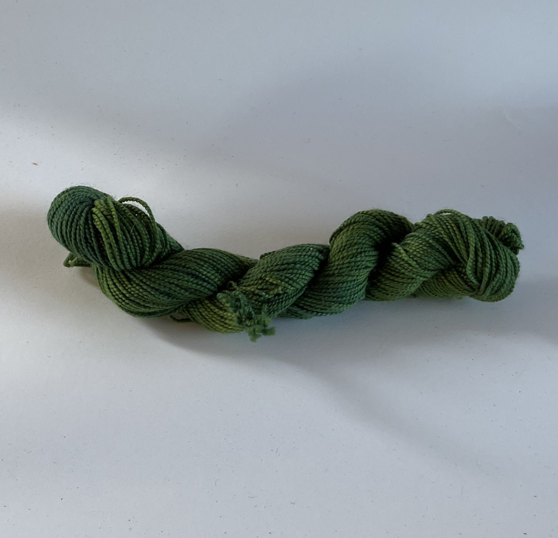 Denne mini er samme kvalitet som vores almindelige strømpegarn, blot kun 20 g. Den er farvet med engbrandbæger og indigo til en skøn grøn farve. Der er nok til f.eks. hæl og tå på et par strømper.