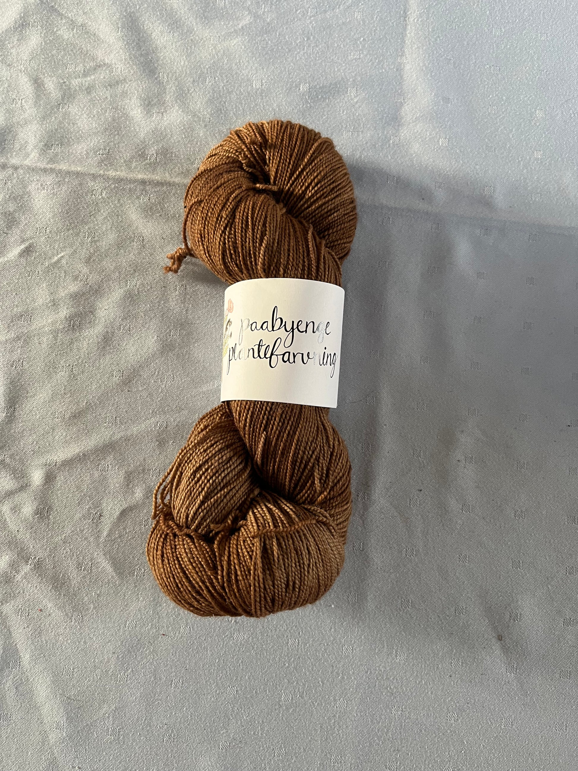 Denne strømpegarn er perfekt til både strømper men også anden beklædning til både børn og voksne. Den er blød og lækker også for sart hud. Her er den farvet med valnøddeskaller til en smuk brun farve.